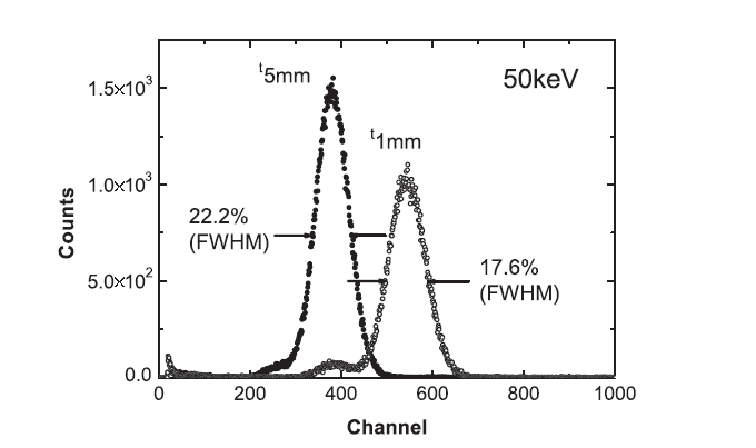 CsI(Tl)的最重要特征是其高光產率(≥104光子/ MeV),并且其發射光譜在約550 nm處具有最大值,與非晶和結晶硅光電二極管完全兼容。研究了CsI:Tl單晶閃爍體的發光效率與X射線乳腺攝影和一般X射線成像所用能量范圍內的晶體厚度和X射線管電壓的關系。