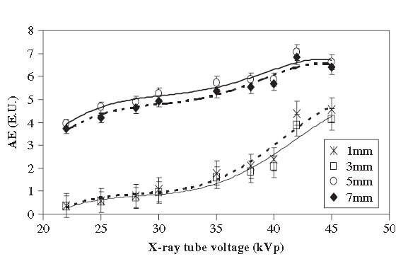Variation of absolute luminescence efficiency(AE) of CsI:Tl crystals for Mammography(22–49kVp) X-ray tube voltages. AE units: μWs/mRm2.Points: measured data, line:fitted curve