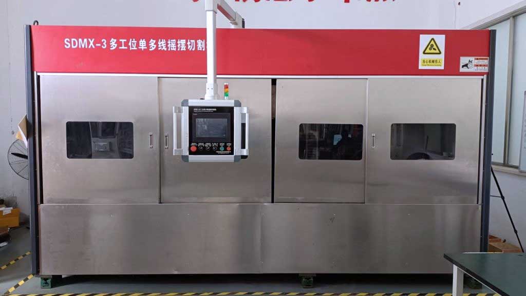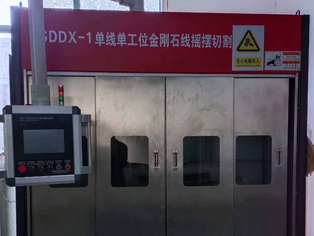 通過(guò)多根高速穩(wěn)定往復(fù)運(yùn)轉(zhuǎn)的金剛線對(duì)固定在工作區(qū)間內(nèi)的晶體坯料進(jìn)行精密切割,在其工作區(qū)間內(nèi),一次能夠同時(shí)切割幾十到幾千片同一厚度的產(chǎn)品,所以常被用于大批量產(chǎn)品的快速精密加工。