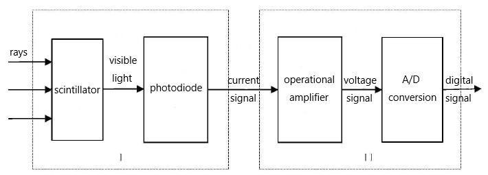 從探測(cè)器結(jié)構(gòu)圖(圖2)可以清楚地看到工業(yè)CT探測(cè)器的信號(hào)轉(zhuǎn)換過(guò)程。首先,射線信號(hào)進(jìn)入閃爍體,在閃爍體中產(chǎn)生可見(jiàn)光。光電二極管將可見(jiàn)光轉(zhuǎn)換為電流信號(hào)。然后,i-v轉(zhuǎn)換電路將電流信號(hào)轉(zhuǎn)換成電壓信號(hào)。最后,由AD轉(zhuǎn)換裝置將其轉(zhuǎn)換為數(shù)字信號(hào),并傳輸至數(shù)據(jù)傳輸系統(tǒng)。