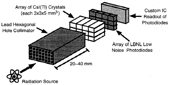 圖解說(shuō)明了離散閃爍相機(jī)的模塊。該原型具有一個(gè)3×4像素陣列,每個(gè)像素由一個(gè)3×3?5 mm3 CsI(TI)晶體與一個(gè)3×3 mm2 PIN光電二極管耦合組成。讀出電路由兩個(gè)3×3 mm2的IC組成。可以從單個(gè)模塊的陣列中構(gòu)造出具有有用成像尺寸的相機(jī)。