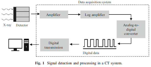 CT信號檢測與處理的工作流程如圖1所示。在X射線CT處理鏈中,檢測步驟通過物理探測器來執行,物理探測器捕獲衰減的X射線束并將其轉換為電信號,然后將電信號轉換為二進制編碼信息。如圖1所示,在幾個處理步驟之后,結果可用于計算機上的最終可視化和解釋。