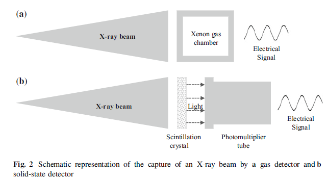在傳統的基于衰減的CT中,X射線在穿過材料的過程中由于吸收或散射而被衰減。然后通過使用X射線檢測器捕獲衰減的X射線來測量衰減。多年來,檢測技術已經有了相當大的進步。檢測器捕獲X射線束并將其轉換為電信號。X射線能量到電信號的這種轉換主要基于兩個原理:氣體電離檢測器和閃爍(固態)檢測器。兩種檢測原理的示意圖如圖2所示。氣體電離檢測器將X射線能量直接轉換為電能,而閃爍檢測器將X射線轉換為可見光,然后將光轉換為電能。